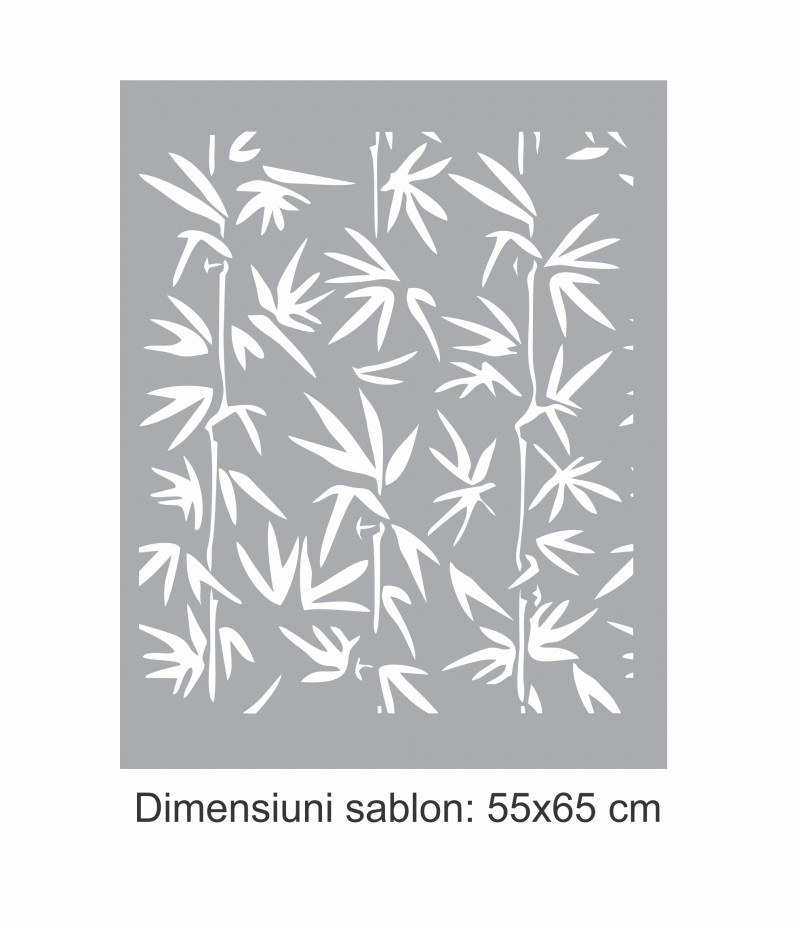Sablon bambus PREVAZUT CU ADEZIV SPECIAL PENTRU VOPSEAUA LAVABILA EXISTENTA PE PERETE. Dimensiuni sablon 55x65 cm. Aplicati sablonul pe perete, lipiti bine marginile, aplicati vopseaua, indepartati sablonul. Spalati sablonul intre utilizari daca acesta se incarca cu vopsea. Dupa uscare adezivul revine pe sablon. Refolositi.